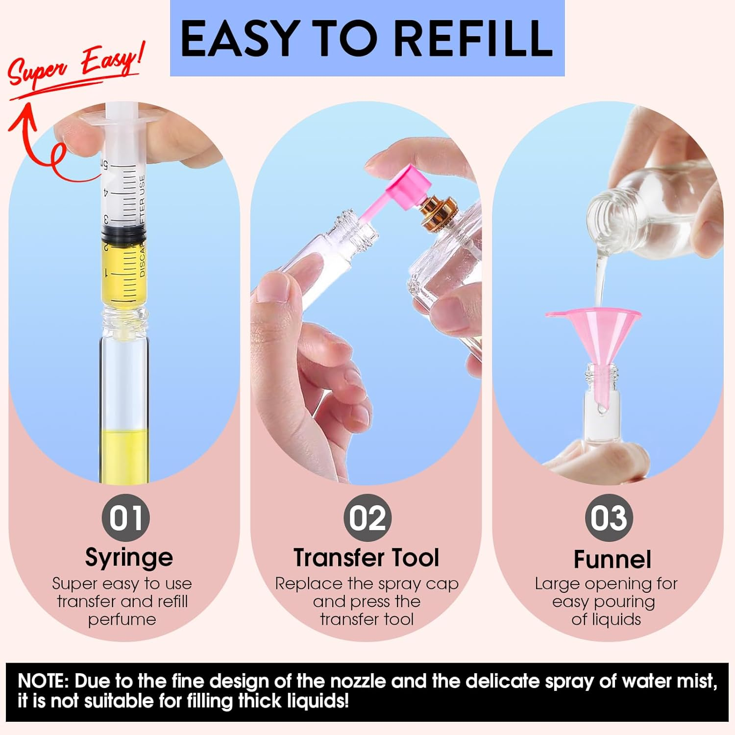 • 【Package Included】- 6pcs refillable perfume bottles, 2x funnel, 1x syringe, 3x transfer tools and 1x storage bag , enough quantity to satisfy your different needs, also you can share some with friends or family.