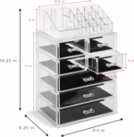 This case features clear construction to store your makeup and jewelry with an effortless view. Three drawers on the bottom unit are ideal for oversize cosmetics, toiletries, and grooming tools, while the top four drawers hold smaller items. The removable top tray compartment is great for organizing brushes, lipsticks, eye pencils, etc!