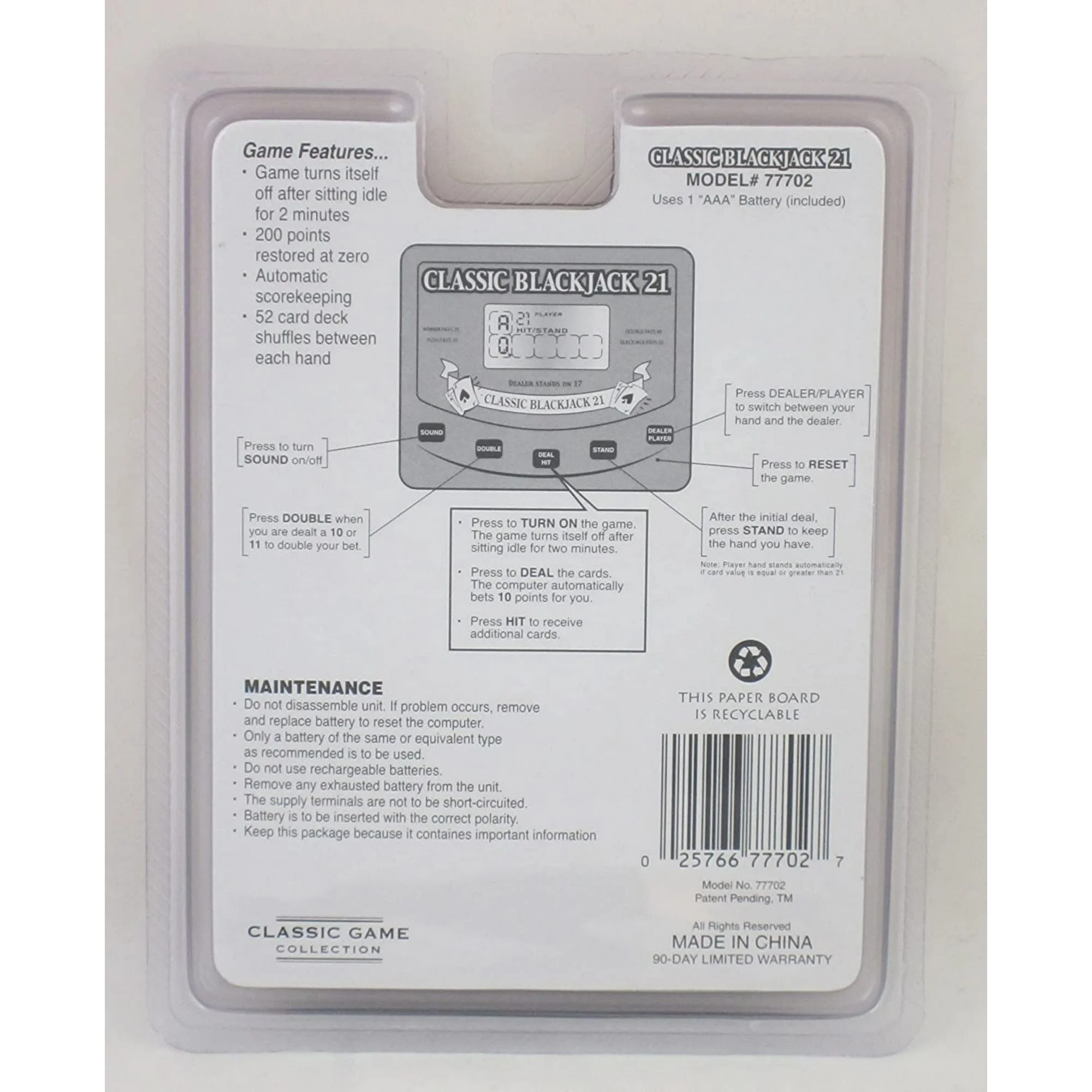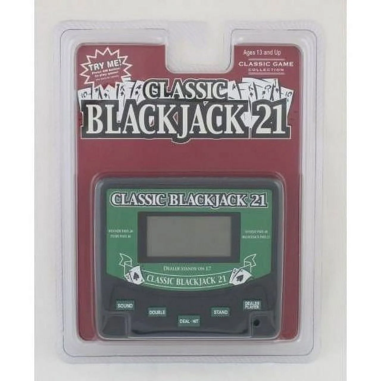 Classic card game of Blackjack in a convenient handheld, electronic version/. 52 card deck shuffles between each hand. 200 points restored at zero. Game turns itself off after sitting idle for 2 minutes, Uses 1 AAA Battery Included.