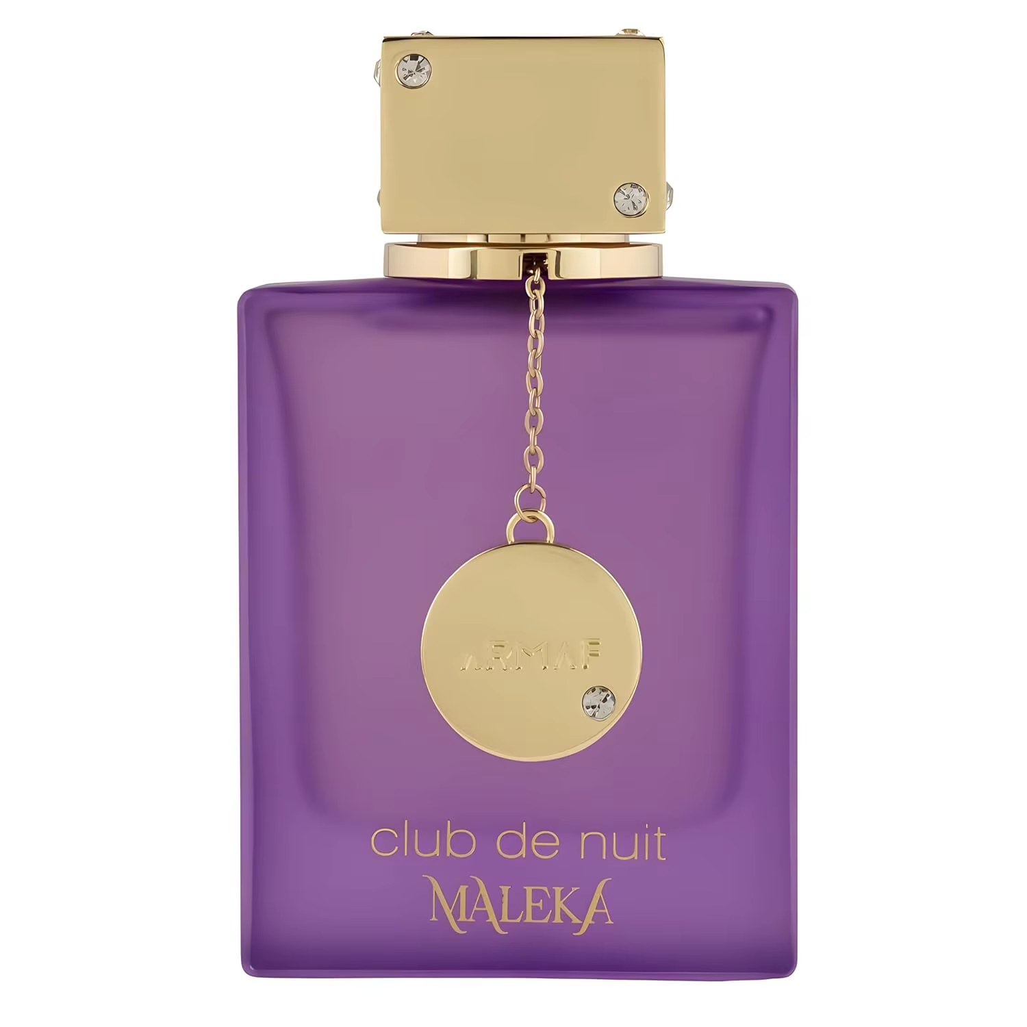 Design: Unique square purple glass bottle decorated with gold medal decoration and matching bottle cap
