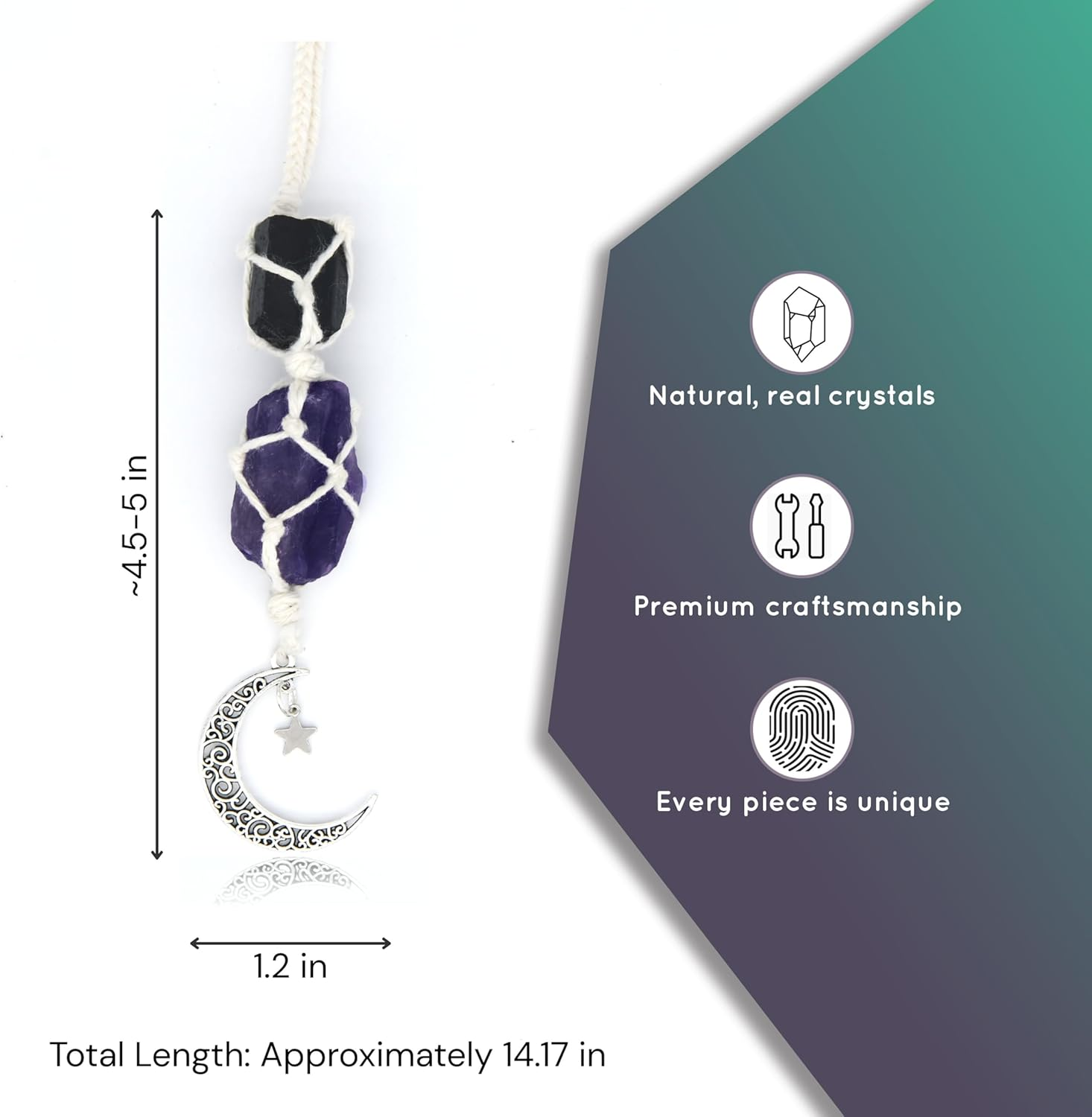 Whether you are going through a rough patch or just need some more positivity in your life, our car charms will make excellent companions. Each one features natural crystals paired with a crescent moon and star charm, all strung together with a nifty rope for easy hanging.
