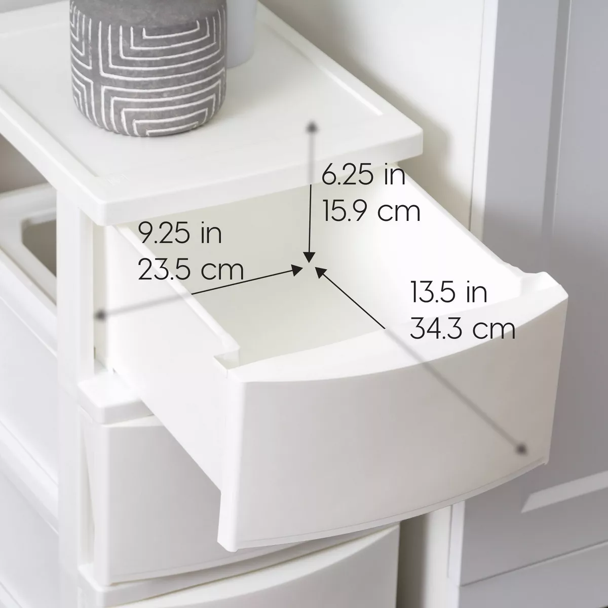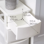 • OVERALL DIMENSION: The outside measurement is 15.625″ L x 12.13″ W x 24.50″ H. The measurement per drawer is 13.5″ W x 9.25″ D x 6.25″ H