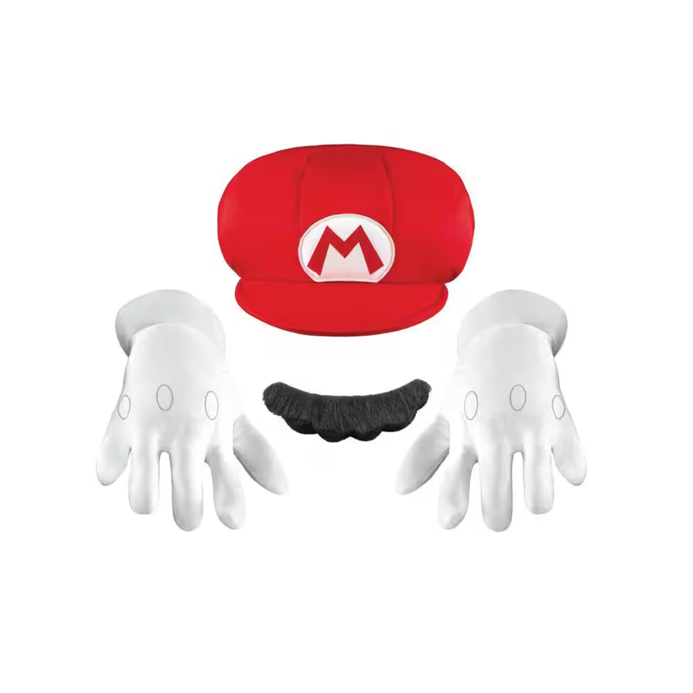 It’s Mario. Become one of everyone’s favorite classic video game characters when you wear these Mario accessories for kids! This Super Mario Halloween costume kit for children includes a hat, pair of gloves and self-adhesive faux mustache for the perfect video game character look. Find even more Super Mario Brothers costume accessories on our website. 1 size fits most children.