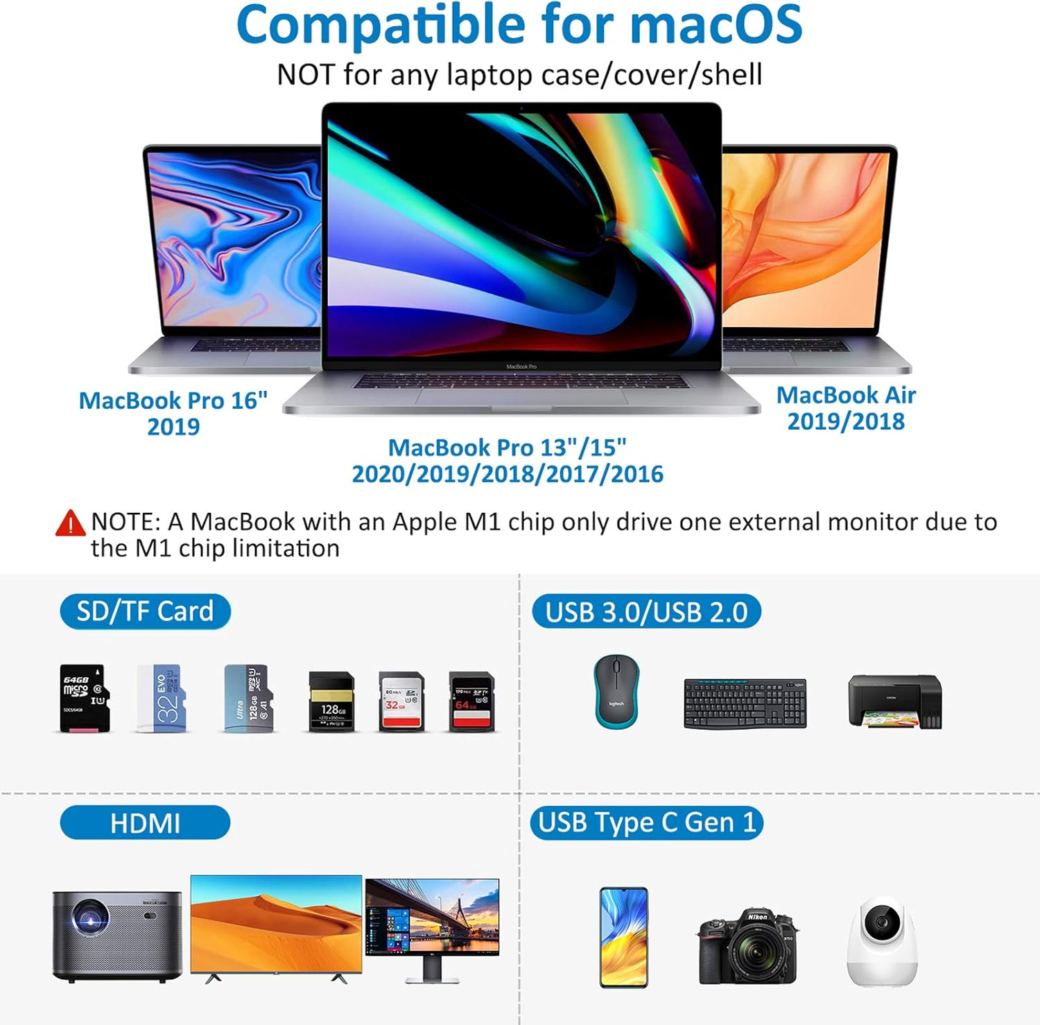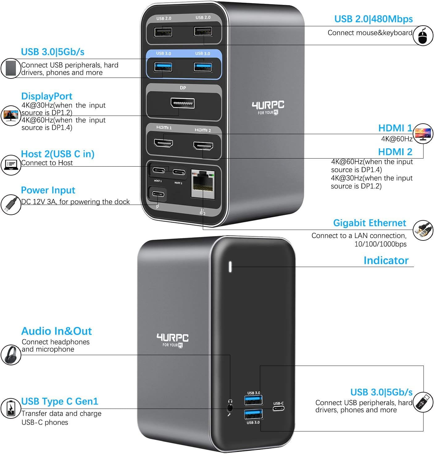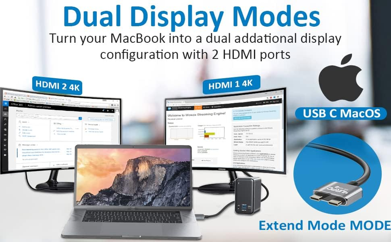 *For MacBook(NON-M1), please use the dual USB C cable to connect the dock and MacBook via Host1 and Host2 port, access two monitors via HDMI1 and HDMI2 port or via HDMI 1 and DP port***NOTE: